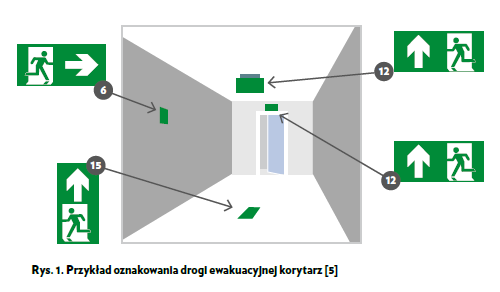 − wszelkie zmiany kierunku w korytarzach, na schodach i otwartych przestrzeniach stanowiących część drogi ewakuacyjnej powinny być oznaczone znakami pośrednimi;