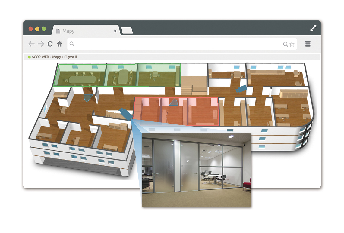 Wygodną obsługę systemu ACCO NET zapewnia aplikacja internetowa ACCO Web, do której dostęp można uzyskać z dowolnego miejsca na świecie. Kilku operatorów jednocześnie może mieć szybki i wygodny wgląd w stan obiektów oraz przełączać się między nimi, jak również pomiędzy pojedynczymi strefami systemu. Każdy z budynków może mieć przypisaną mapę, z której poziomu dostępna jest zdalna obsługa pojedynczych przejść i podgląd obrazu z kamer IP.
