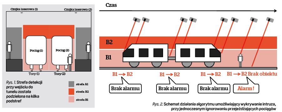 Strefa A1 służy do detekcji intruza na peronie, strefa B2 do ignorowania przyjeżdżającego pociągu, B1 do wykrycia pociągu i intruza. W zastosowanym specjalnym algorytmie pracy dodano czas zwłoki do podjęcia decyzji o niewysyłaniu alarmu o przejeżdżającym pociągu. Alarm w strefie B1 zostanie zignorowany, gdy tuż przed albo tuż po uaktywni się alarm B2 (rys. 2).