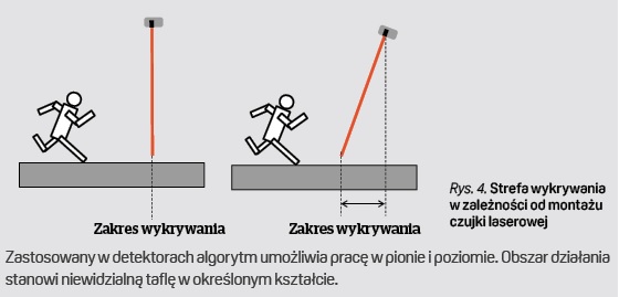 Przy montażu należy uwzględnić fakt, że najlepiej sprawdzi się czujka zainstalowana pod pewnym kątem. Dzięki temu zwiększy się przestrzeń, w której intruz może zostać wykryty (rys. 4).