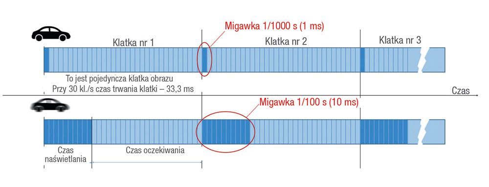 Konsekwencje tego są dwie. Po pierwsze, szybko poruszający się obiekt będzie eksponowany na przetworniku przez krótką chwilę, więc jego obraz w ruchu będzie ostry i wyraźny. Po drugie, czas „zbierania” światła z przetwornika jest bardzo krótki, a więc obraz będzie miał słabą jasność. Scena musi być zatem bardzo dobrze oświetlona światłem widzialnym (np. słoneczny dzień) lub promieniowaniem podczerwonym, gdy pracuje w trybie czarno-białym (tak się właśnie dzieje w kamerach ANPR). Jeśli prędkość migawki zmniejszymy dziesięciokrotnie, do 1/100 s, to przetwornik będzie „czytał” obraz przez 10 ms i czekał 13,3 ms na kolejną klatkę. Obraz uzyska lepszą jasność, gdyż czas ekspozycji przetwornika będzie 10x dłuższy, ale szybko poruszający się pojazd stanie się w kadrze rozmazany, bo jego faza ruchu będzie się eksponować 10x dłużej niż w poprzednim przypadku.