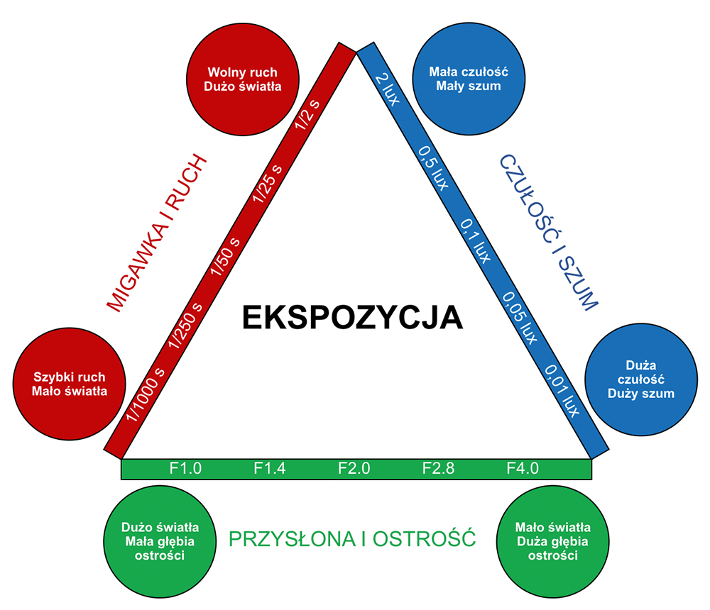 Przykładowo, aby uzyskać dobrej jakości obraz szybko poruszającego się obiektu, potrzebujemy szybkiej migawki. To jednak spowoduje spadek jasności obrazu, bo czas ekspozycji będzie krótki. Powstaje zatem problem właściwego obrazowania ruchu w słabych warunkach oświetleniowych. Można to skompensować większym otwarciem przysłony, ale im bardziej ją otworzymy, tym krótsza będzie głębia ostrości obrazu i mniejszy zasięg skutecznej obserwacji. Trzeba więc wykorzystać trzeci bok trójkąta i przy optymalnej wartości przysłony zwiększyć czułość, ale też w granicach rozsądku, bo w przeciwnym razie popsujemy obraz dużą zawartością szumów. Z powyższego przykładu wynika, że zawsze trzeba znaleźć równowagę między czasem migawki, czułością i wartością przysłony, a zmianę jednego z tych parametrów powinniśmy niejako skompensować dostosowaniem dwóch pozostałych.