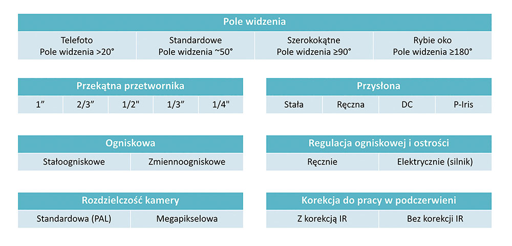 Kryteriów klasyfikacji jest kilka. Pierwszym i chyba najbardziej oczywistym jest pole widzenia. Kolejnym jest wielkość przetwornika obrazu, do którego dobierany jest obiektyw. I tu na chwilę warto się zatrzymać i zastanowić: co się stanie, gdy do kamery z przetwornikiem 1/2” zamontujemy obiektyw 1/3”? Powierzchnia obrazowania obiektywu jest mniejsza od powierzchni przetwornika, więc w efekcie na obrazie z kamery otrzymamy obraz nie tylko „za obiektywem”, ale także krawędzi obudowy samego obiektywu, co nie jest zjawiskiem pożądanym. W sytuacji odwrotnej, czyli w przypadku zamontowania obiektywu 1/2” do kamery z przetwornikiem 1/3”, otrzymamy wprawdzie obraz normalny, ale o mniejszym polu widzenia niż wynikałoby to z ogniskowej obiektywu (część pola widzenia obiektywu jest w takim przypadku niewykorzystana). Najlepszym pomysłem jest zatem dobór wielkości powierzchni obrazowania obiektywu równej wielkości przetwornika.