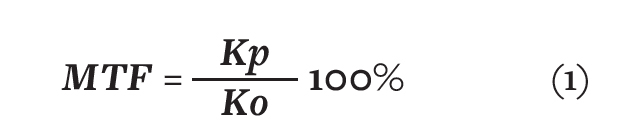 Jeśli jako jasność minimalną przyjmiemy wartość 0, a maksymalną wartość 100, otrzymamy Ko równe 1. Załóżmy, że po przejściu przez obiektyw maksymalna jasność linii białej jest równa 70, a minimalna jasność linii czarnej wynosi 10. Po podstawieniu do wzoru (2) otrzymamy Kp równe 0,75. Po podstawieniu wartości Kp i Ko do wzoru (1) otrzymamy współczynnik MTF równy 75%. Oznacza to, że kontrast obrazu odwzorowanego przez obiektyw stanowi 75% kontrastu obrazu oryginalnego (lub inaczej: kontrast obrazu oryginalnego zmalał o 25% po przejściu przez obiektyw).