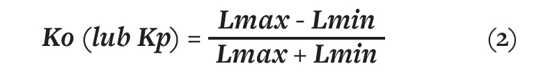 Czym jest kontrast? Najkrócej rzecz ujmując, to stosunek jasności najjaśniejszego do najciemniejszego punktu obrazu. Aby lepiej to wyjaśnić, wróćmy do rozdzielczości optycznej i testowej tablicy rozdzielczości z pionowymi liniami [2]. Można łatwo zdefiniować kontrast dla pary linii czarna + biała. Opisuje to wzór: