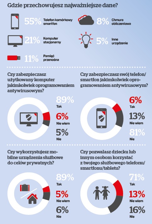 Z raportu wynika, że Polska jest w trakcie globalnej rewolucji mobilnej, choć może nie w jej głównym nurcie. Większość, bo 55 proc. potwierdza, że najważniejsze dane przechowuje w swoim telefonie komórkowym czy smartfonie, a już tylko 21 proc. wskazuje w tej roli komputer stacjonarny. Zastanawia zatem, dlaczego te urządzenia nie są traktowane równorzędnie w zakresie stosowanych zabezpieczeń. Polacy sięgają też po nowe sposoby na przechowywanie danych, 8 proc. ankietowanych zapisuje je już w chmurze obliczeniowej.
