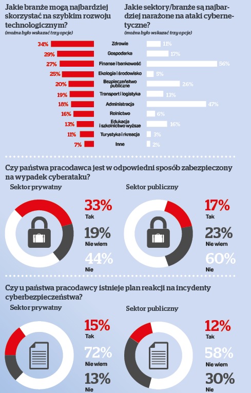 Polacy krytycznie oceniają również poziom zabezpieczeń stosowanych w systemach informatycznych ich pracodawców. Zdaniem co trzeciego ankietowanego, będącego przedstawicielem sektora prywatnego, są one w odpowiedni sposób zabezpieczone na wypadek cyberataku, ale 48 proc. jest przeciwnego zdania. W przypadku sektora publicznego oceny są jeszcze bardziej krytyczne – 17 proc. badanych twierdzi, iż poziom zabezpieczeń jest wystarczający, a aż 60 proc uważa, że tak nie jest.