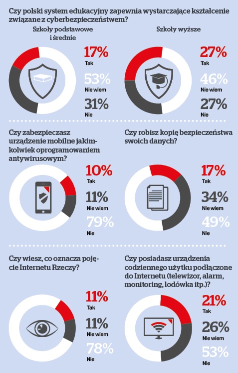 Mimo poważnych konsekwencji dotyczących nienależytej ochrony przed zagrożeniami płynącymi z internetu zdaniem tylko 19 proc. badanych w Polsce mówi się dostatecznie dużo na ten temat. Kto zatem powinien być za to odpowiedzialny? Ankietowani krytycznie oceniają wiedzę, jaką przekazuje polski system edukacyjny. W przypadku szkół podstawowych i średnich tylko wg 16 proc. opinii kształcenie spełnia wymagania związane z cyberbezpieczeństwem, przeciwnego zdania jest 31 proc. Niewiele lepiej wypada ocena szkół wyższych, które zdaniem 27 proc. badanych dostatecznie wywiązują się ze swoich obowiązków edukacyjnych w zakresie cyberbezpieczeństwa. To jednak bardzo niski poziom, mogący przekładać się na niewystarczającą wiedzę merytoryczną Polaków na tematy związane z ochroną swoich zasobów, a także zagrożeniami wynikającymi z przestępczości w sieci.
