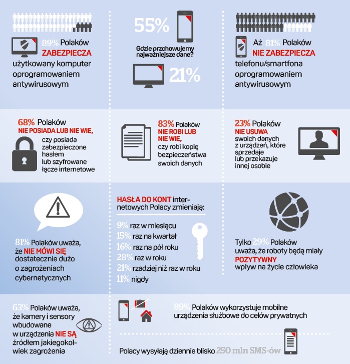 Zdaniem ankietowanych Polska nie jest specjalnie zagrożona cyberprzestępczością, czym poniekąd tłumaczą własną nieostrożność. Ta nieświadomość ma też bardziej prozaiczny wymiar, gdyż w razie awarii urządzenia konsumenci bezrefleksyjnie przekazują je do napraw serwisowych, nie zastanawiając się, co może stać się z zawartymi tam wrażliwymi danymi. To zaskakujące, tym bardziej że sami ankietowani przyznają, iż właśnie telefon jest teraz nośnikiem, na którym przechowuje się najcenniejsze dane.