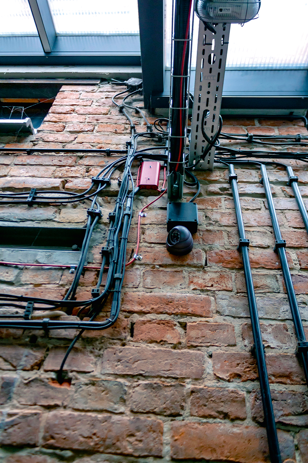 Ze względu na stropy, które zostały zabezpieczone płytami ognioodpornymi, nie było możliwości wykonania instalacji techniką podtynkową, trzeba było zastosować technikę natynkową. Przewody do elementów pętlowych ułożono w czarnych rurkach, przewody ognioodporne natomiast bezpośrednio na atestowanych uchwytach na stropie i ścianach. Dzięki temu idealnie pasują do charakteru kamienicy.