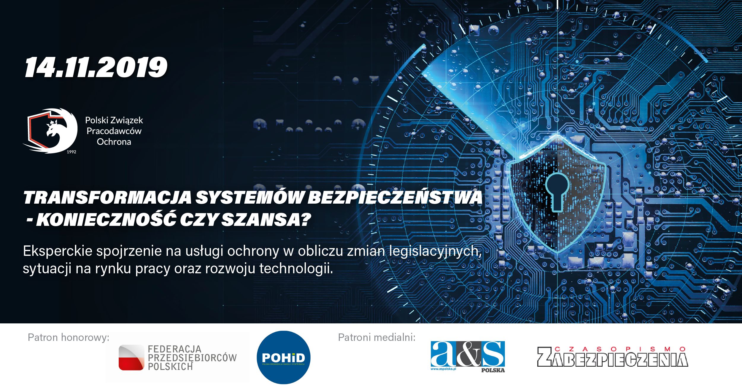 Zapraszamy do udziału w Konferencji pt. Transformacja systemów bezpieczeństwa – konieczność czy szansa?, podczas której eksperci ze świata biznesu przybliżą kwestie związane ze zmianami legislacyjnymi i nowymi regulacjami w obszarze zatrudnienia. Nie chcemy podążać za zmianami, chcemy być ich świadomymi kreatorami i aktywnie rozwijać się w dynamicznym otoczeniu biznesowym, dlatego zapraszamy do wspólnej dyskusji na temat wyzwań jakie stoją przed branżą bezpieczeństwa.