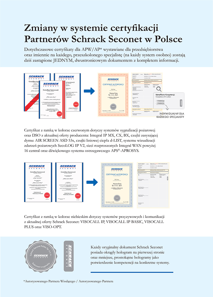 Zaświadczenia według nowego wzorca (od roku 2019) to dokumenty potwierdzające odbycie podstawowego szkolenia wprowadzającego (produktowo-projektowego). Udział w szkoleniu, a tym samym zaświadczenie nie upoważniają do prowadzenia prac związanych z programowaniem, instalacją oraz serwisem systemów sygnalizacji pożarowej, dźwiękowych systemów ostrzegawczych i systemów przyzywowych Schrack Seconet.